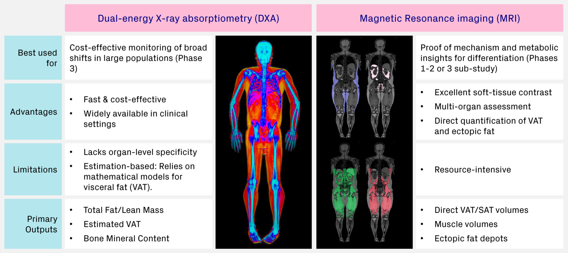 Ultimately, the decision to implement DXA or MRI hinges on the specific research questions, protocol endpoints and the phase of your clinical program. DXA remains a pragmatic choice for large-scale Phase 3 trials where the primary goal is to monitor broad shifts in fat and lean mass across a large cohort of participants. However, as the obesity landscape shifts toward metabolic differentiation and functional improvements, MRI is becoming the method of choice for Phase 1 and 2 trials and Phase 3 sub-studies.