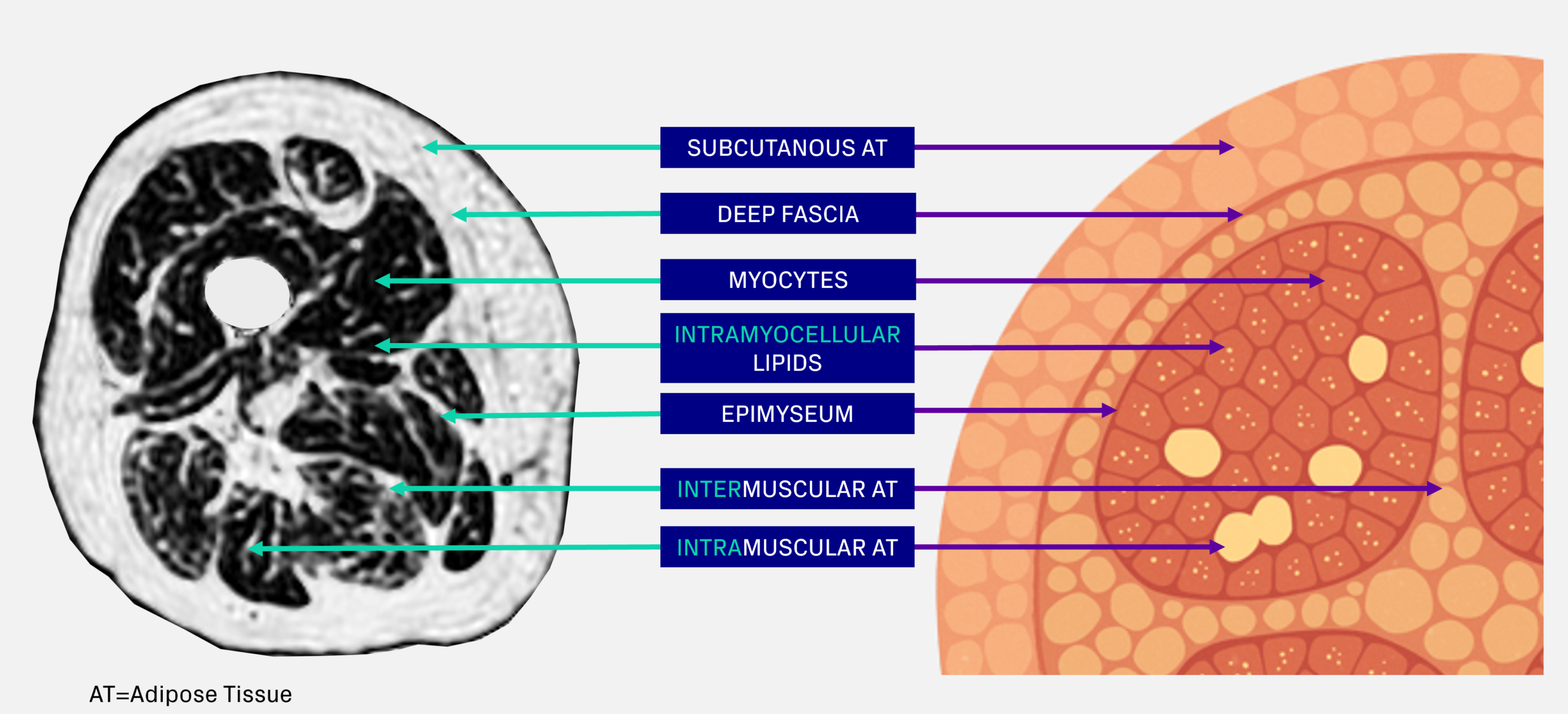 - Intramuscular adipose tissue (intra-MAT): Fat located within muscle, expressed as volume or fat fraction. It includes fat between muscle fibers and fascicles, within the epimysium.