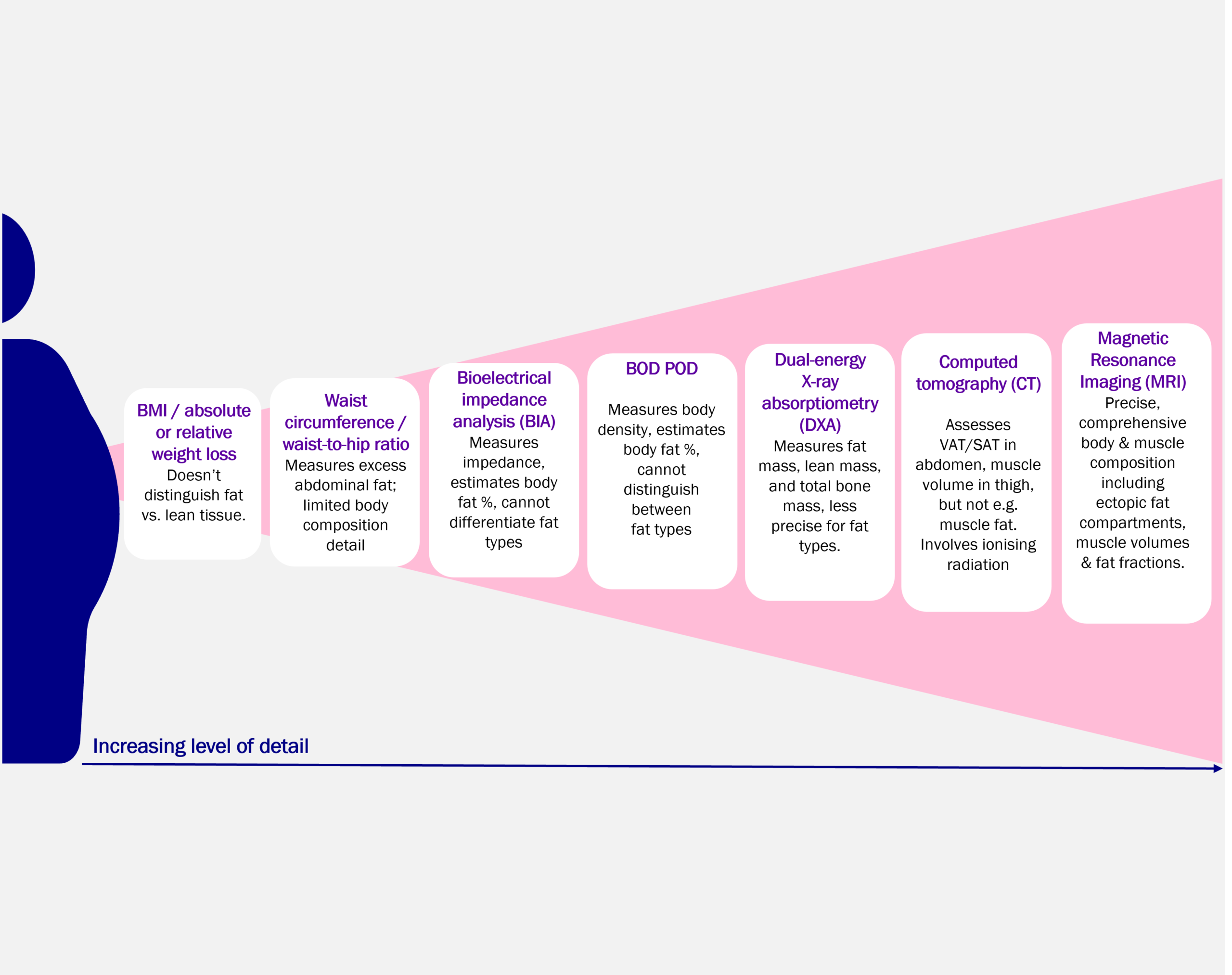 It’s important to understand the different approaches to assessing weight loss and body composition to design robust trials and generate meaningful evidence. Several methods are available (Figure 1), each offering different levels of detail. At Antaros Medical, we apply DXA (Dual-energy X-ray Absorptiometry), CT (Computed Tomography), and MRI (Magnetic Resonance Imaging) to investigate changes in body and muscle composition.