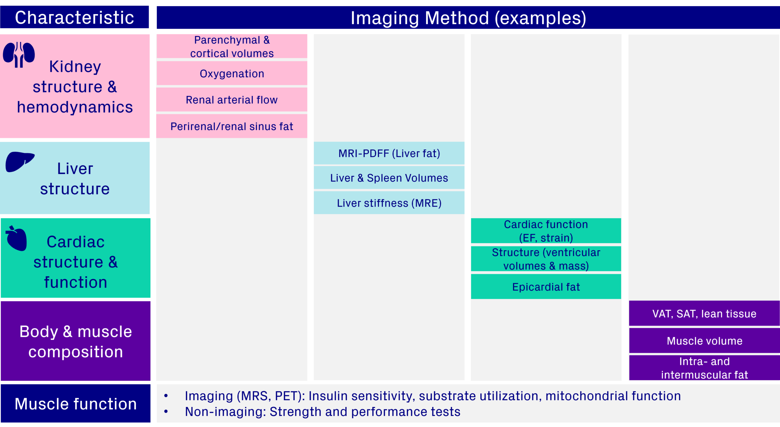 Including body and muscle composition endpoints adds depth to your trial, moving beyond simple weight metrics to show how treatments affect fat and muscle quality. These measures can also be combined with functional assessments, such as strength or work achieved per unit of fat free muscle volume, for a more complete picture of patient outcomes. When paired with imaging biomarkers from key metabolic organs, such as the liver, kidney, and heart, this approach provides a holistic view of efficacy and safety, helping demonstrate long-term health benefits (Figure 7).