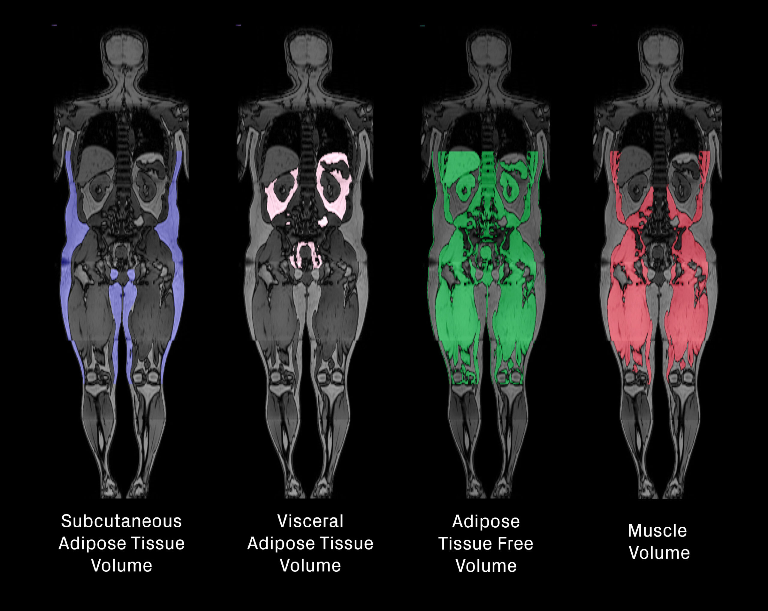 MRI provides a detailed volumetric assessment of fat and lean tissue by quantifying visceral adipose tissue (VAT), subcutaneous adipose tissue (SAT), adipose tissue-free volume and skeletal muscle volume from whole-body images (Figure 3). This enables a deeper understanding of where weight loss originates, often referred to as the “quality” of weight loss. Beyond overall fat and lean volumes, MRI can also reveal changes in specific ectopic fat depots in and around organs such as the liver, kidney, muscle, heart, and pancreas (Figure 4).